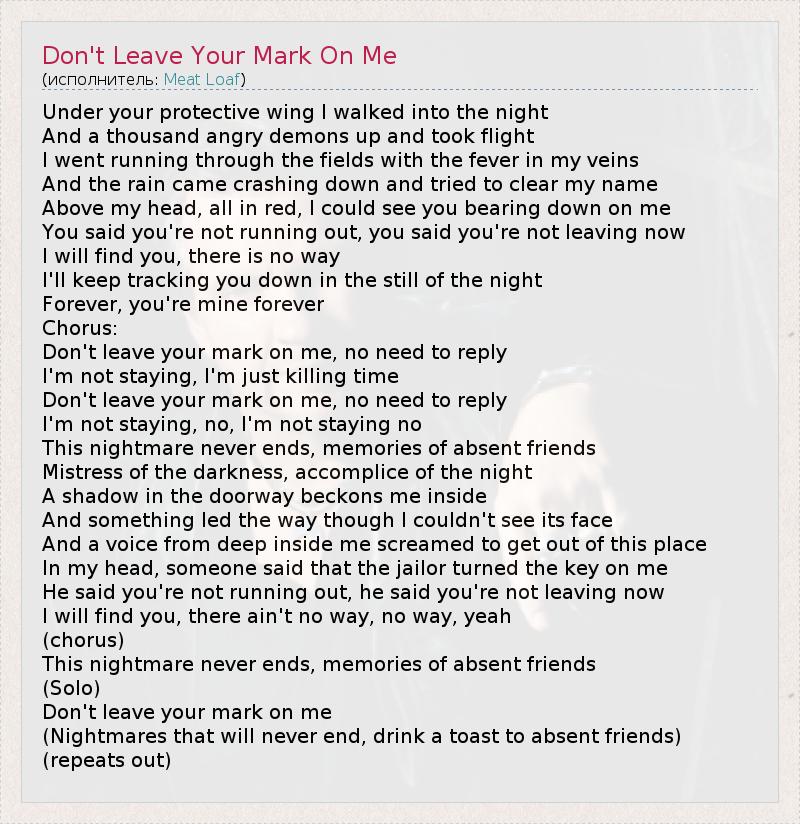 ГлавнаяИсполнителиMeat LoafDon't Leave Your Mark On Me