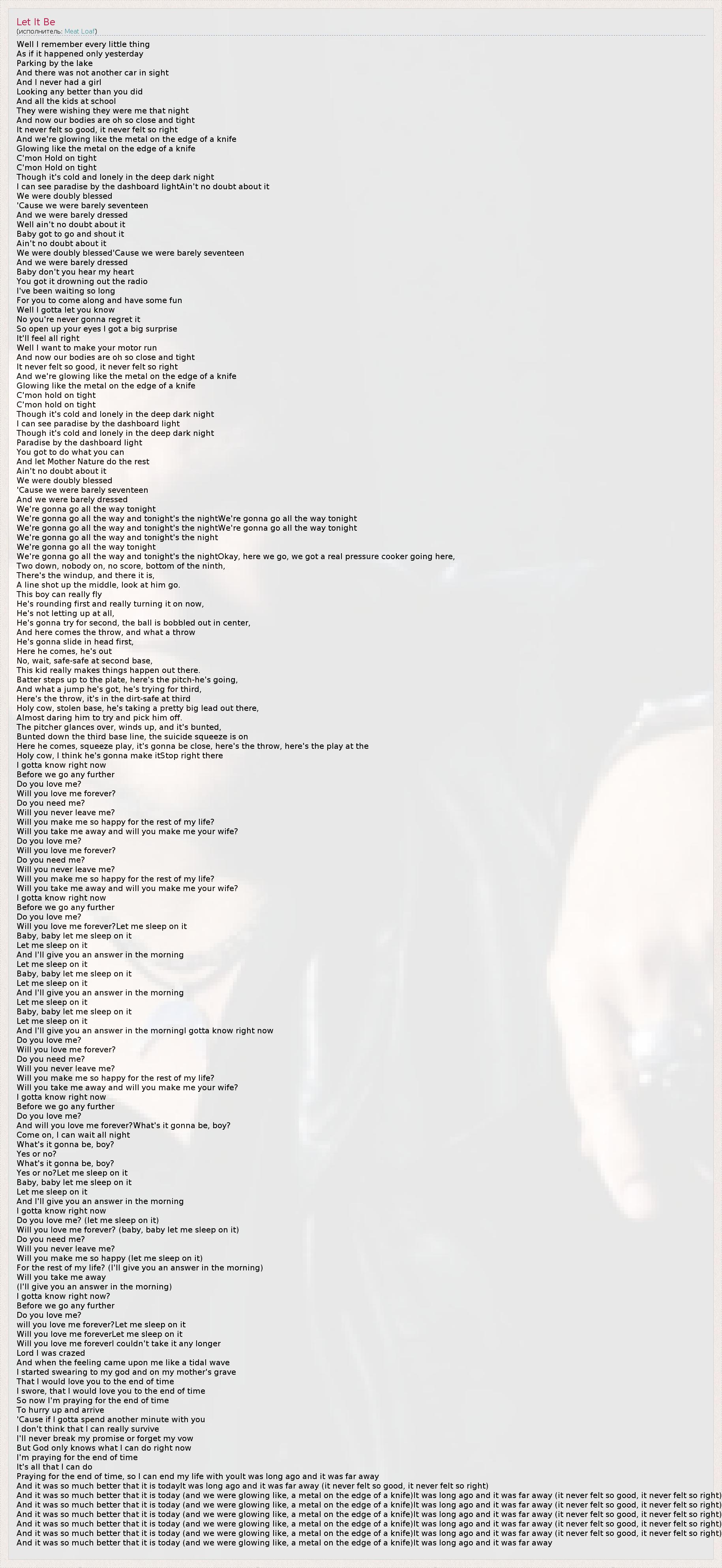 Это интересно:Мясной рулет, в оригинале meat loaf, - так по доброте душевной называл Марвина Ли Эдея (Marvin Lee Aday) его школьный тренер по футболу. Большой, неуклюжий, грузный, на футбольном поле Марвин вызывал скорее сочувствие и, в общем-то, вполне заслуживал такого нелестного прозвища. Через каких-нибудь 10-15 лет "Мясной рулет" прославится на весь мир, запишет мировой бестселлер "Bat out of Hell", станет рекордсменом... продолжение