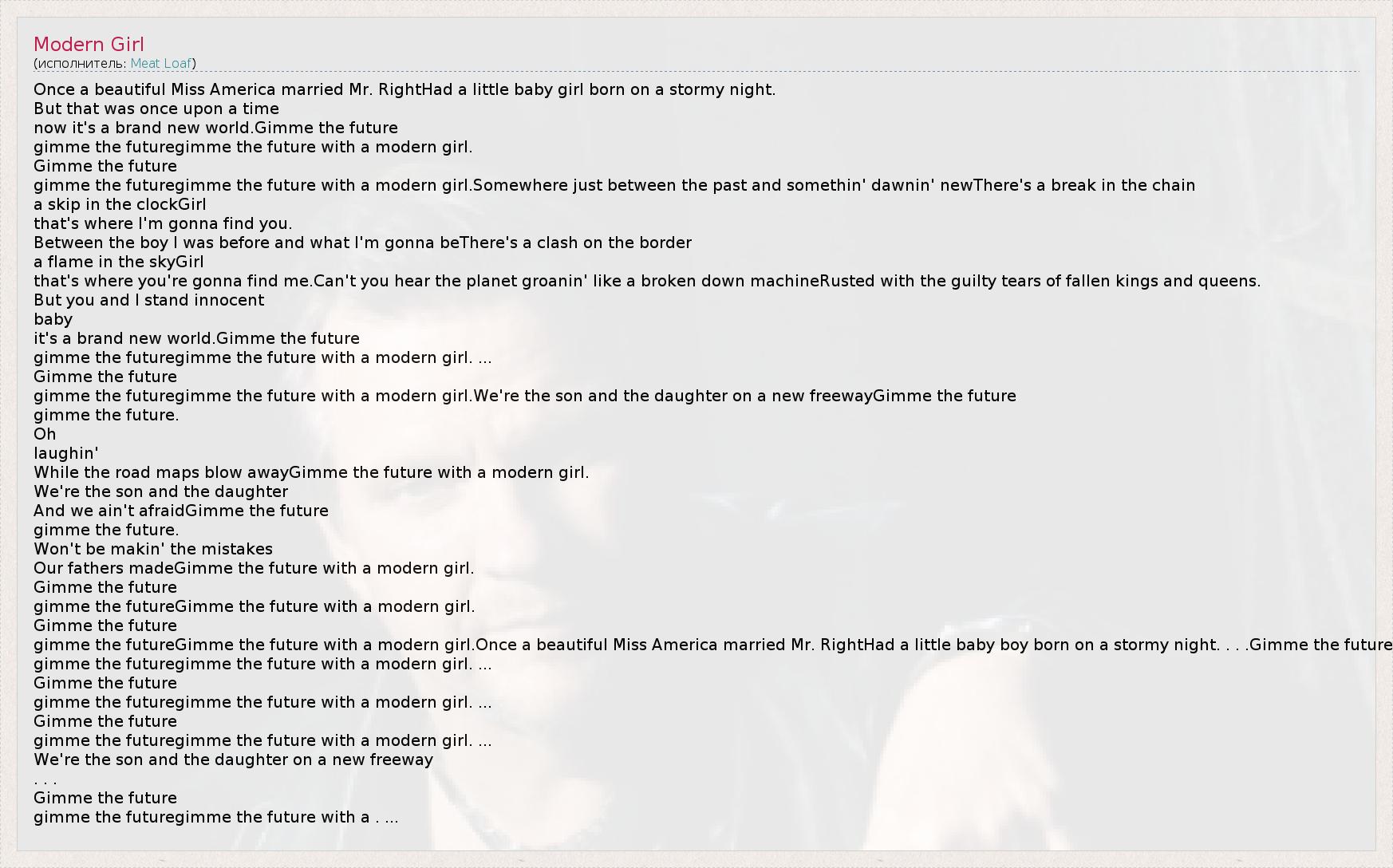 gimme the futureGimme the future with a modern girl.Once a beautiful Miss America married Mr. RightHad a little baby boy born on a stormy night. . . .Gimme the future