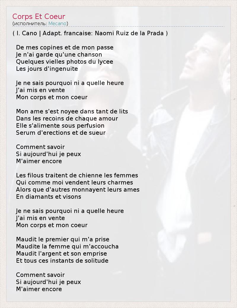 ( I. Cano | Adapt. francaise: Naomi Ruiz de la Prada ) De mes copines et de mon passe Je n'ai garde qu'une chanson Quelques vielles photos du lycee Les jours d'ingenuite Je ne sais pourquoi ni a quelle heure J'ai mis en vente Mon corps et mon coeur Mon ame s'est noyee dans tant de lits Dans les recoins de chaque amour Elle s'alimente sous perfusion Serum d'erections et de sueur Comment savoir Si aujourd'hui je peux M'aimer encore Les filous traitent de chienne les femmes Qui comme moi vendent leurs charmes Alors que d'autres monnayent leurs ames En diamants et visons Je ne sais pourquoi ni a quelle heure J'ai mis en vente Mon corps et mon coeur Maudit le premier qui m'a prise Maudite la femme qui m'accoucha Maudit l'argent et son emprise Et tous ces instants de solitude Comment savoir Si aujourd'hui je peux M'aimer encore