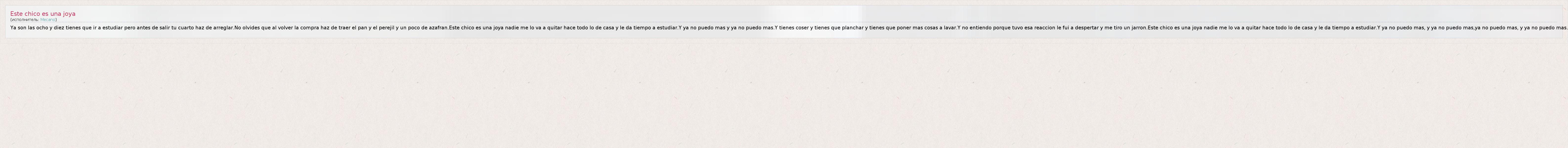 Ya son las ocho y diez tienes que ir a estudiar pero antes de salir tu cuarto haz de arreglar.No olvides que al volver la compra haz de traer el pan y el perejil y un poco de azafran.Este chico es una joya nadie me lo va a quitar hace todo lo de casa y le da tiempo a estudiar.Y ya no puedo mas y ya no puedo mas.Y tienes coser y tienes que planchar y tienes que poner mas cosas a lavar.Y no entiendo porque tuvo esa reaccion le fui a despertar y me tiro un jarron.Este chico es una joya nadie me lo va a quitar hace todo lo de casa y le da tiempo a estudiar.Y ya no puedo mas, y ya no puedo mas,ya no puedo mas, y ya no puedo mas.
