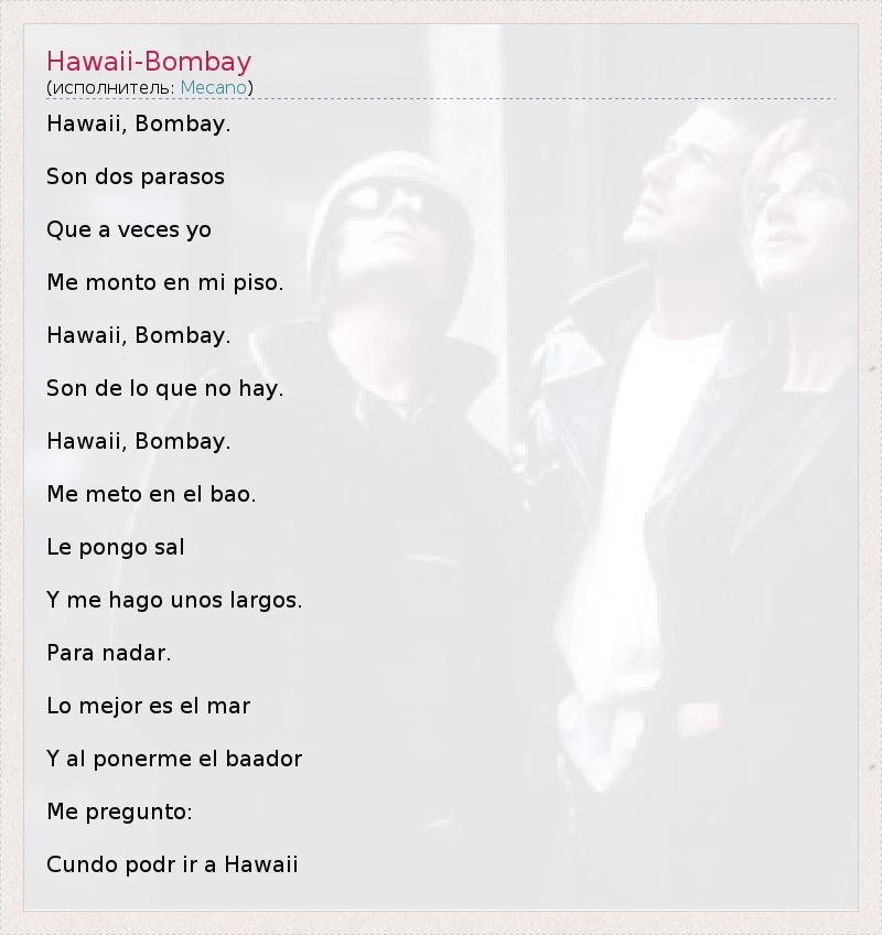Hawaii, Bombay. Son dos parasos Que a veces yo Me monto en mi piso. Hawaii, Bombay. Son de lo que no hay. Hawaii, Bombay. Me meto en el bao. Le pongo sal Y me hago unos largos. Para nadar. Lo mejor es el mar Y al ponerme el baador Me pregunto: Cundo podr ir a Hawaii