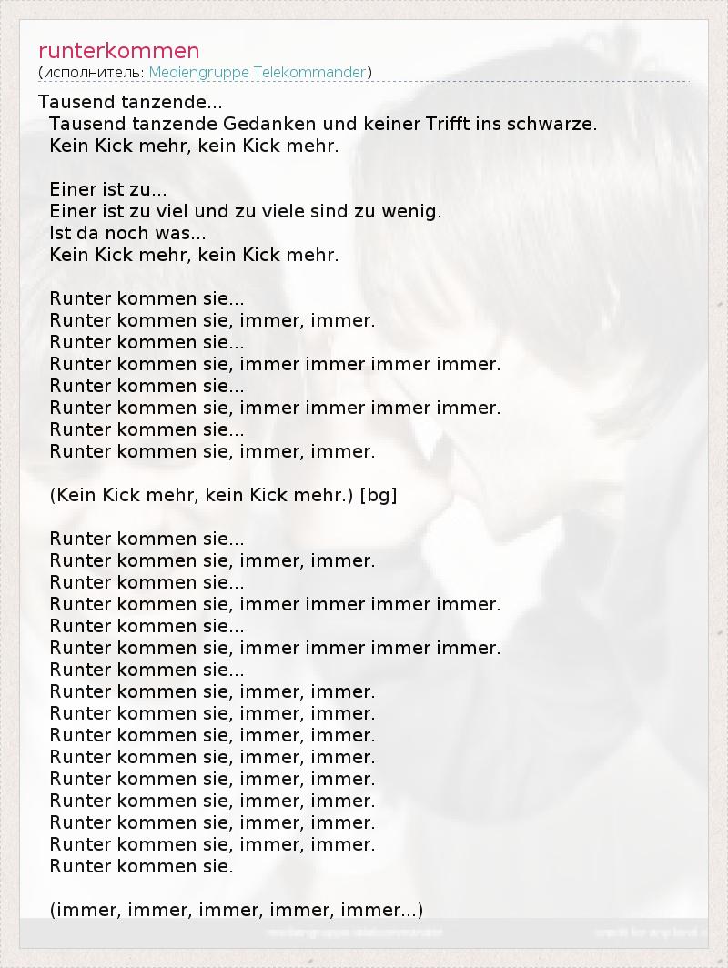 Tausend tanzende... Tausend tanzende Gedanken und keiner Trifft ins schwarze. Kein Kick mehr, kein Kick mehr. Einer ist zu... Einer ist zu viel und zu viele sind zu wenig. Ist da noch was... Kein Kick mehr, kein Kick mehr. Runter kommen sie... Runter kommen sie, immer, immer. Runter kommen sie... Runter kommen sie, immer immer immer immer. Runter kommen sie... Runter kommen sie, immer immer immer immer. Runter kommen sie... Runter kommen sie, immer, immer. (Kein Kick mehr, kein Kick mehr.) [bg] Runter kommen sie... Runter kommen sie, immer, immer. Runter kommen sie... Runter kommen sie, immer immer immer immer. Runter kommen sie... Runter kommen sie, immer immer immer immer. Runter kommen sie... Runter kommen sie, immer, immer. Runter kommen sie, immer, immer. Runter kommen sie, immer, immer. Runter kommen sie, immer, immer. Runter kommen sie, immer, immer. Runter kommen sie, immer, immer. Runter kommen sie, immer, immer. Runter kommen sie, immer, immer. Runter kommen sie. (immer, immer, immer, immer, immer...)