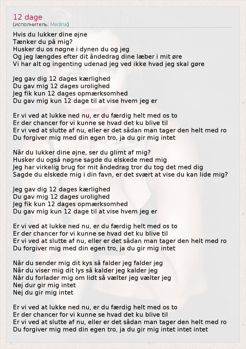 Это интересно:Медина Даниель Уна Вэльбак (англ. Medina, урожденная Андреа Фуэнтеальба Вэльбак) - датская певица и автор песен. Лучшая датская исполнительница на церемонии MTV EMA 2009. Её сингл 'Kun for Mig' стал самым продаваемым на территории Дании в 2009 году. В 2011 году сингл 'Addiction' достиг первой позиции американского танцевального чарта Billboard. Андреа родилась 30 ноября 1982 года в датском городе Орхус,... продолжение