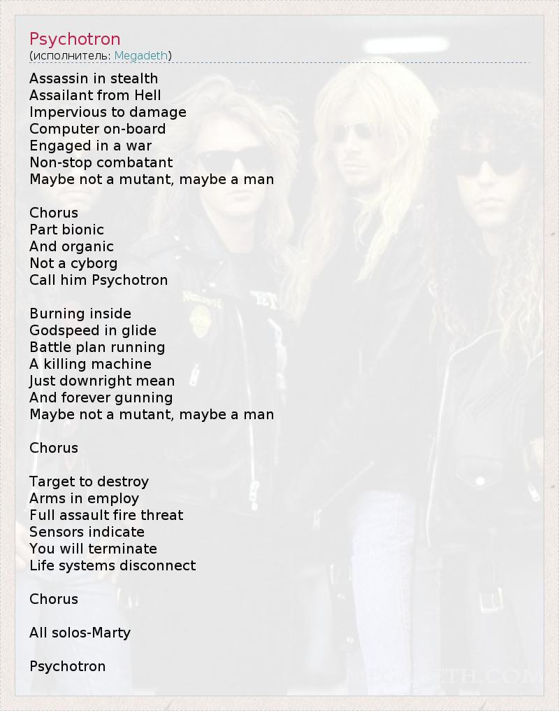 Это интересно:Группа "большой четверки трэш-метала" Megadeth, основанная и удерживающая свою высокую позицию благодаря солисту, фронтмену, автору слов и музыки Дэйву Мастейну (Dave Mustaine). В одних только Соединенных Штатах группа получила четыре платиновых, шесть золотых альбомов и семь номинаций на премию «Грэмми» как лучший исполнитель музыки в жанре хэви-метал.История... продолжение