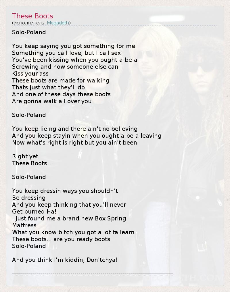 Solo-Poland You keep saying you got something for me Something you call love, but I call sex You've been kissing when you ought-a-be-a Screwing and now someone else can Kiss your ass These boots are made for walking Thats just what they'll do And one of these days these boots Are gonna walk all over you Solo-Poland You keep lieing and there ain't no believing And you keep stayin when you ought-a-be-a leaving Now what's right is right but you ain't been Right yet These Boots... Solo-Poland You keep dressin ways you shouldn't Be dressing And you keep thinking that you'll never Get burned Ha! I just found me a brand new Box Spring Mattress What you know bitch you got a lot ta learn These boots... are you ready boots Solo-Poland And you think I'm kiddin, Don'tchya! --------------------------------------------------------------------------------