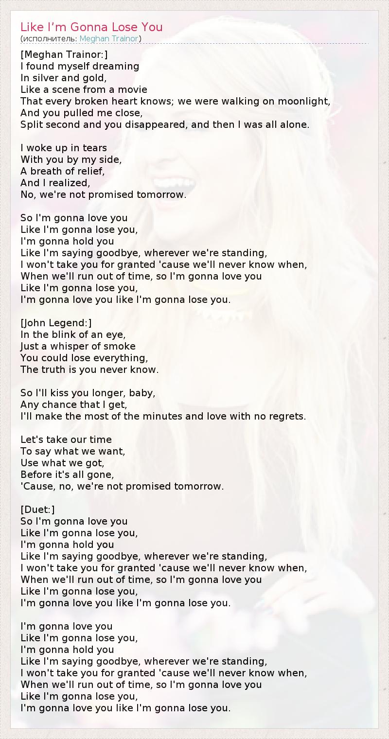 [Meghan Trainor:] I found myself dreaming In silver and gold, Like a scene from a movie That every broken heart knows; we were walking on moonlight, And you pulled me close, Split second and you disappeared, and then I was all alone. I woke up in tears With you by my side, A breath of relief, And I realized, No, we're not promised tomorrow. So I'm gonna love you Like I'm gonna lose you, I'm gonna hold you Like I'm saying goodbye, wherever we're standing, I won't take you for granted 'cause we'll never know when, When we'll run out of time, so I'm gonna love you Like I'm gonna lose you, I'm gonna love you like I'm gonna lose you. [John Legend:] In the blink of an eye, Just a whisper of smoke You could lose everything, The truth is you never know. So I'll kiss you longer, baby, Any chance that I get, I'll make the most of the minutes and love with no regrets. Let's take our time To say what we want, Use what we got, Before it's all gone, 'Cause, no, we're not promised tomorrow. [Duet:] So I'm gonna love you Like I'm gonna lose you, I'm gonna hold you Like I'm saying goodbye, wherever we're standing, I won't take you for granted 'cause we'll never know when, When we'll run out of time, so I'm gonna love you Like I'm gonna lose you, I'm gonna love you like I'm gonna lose you. I'm gonna love you Like I'm gonna lose you, I'm gonna hold you Like I'm saying goodbye, wherever we're standing, I won't take you for granted 'cause we'll never know when, When we'll run out of time, so I'm gonna love you Like I'm gonna lose you, I'm gonna love you like I'm gonna lose you.