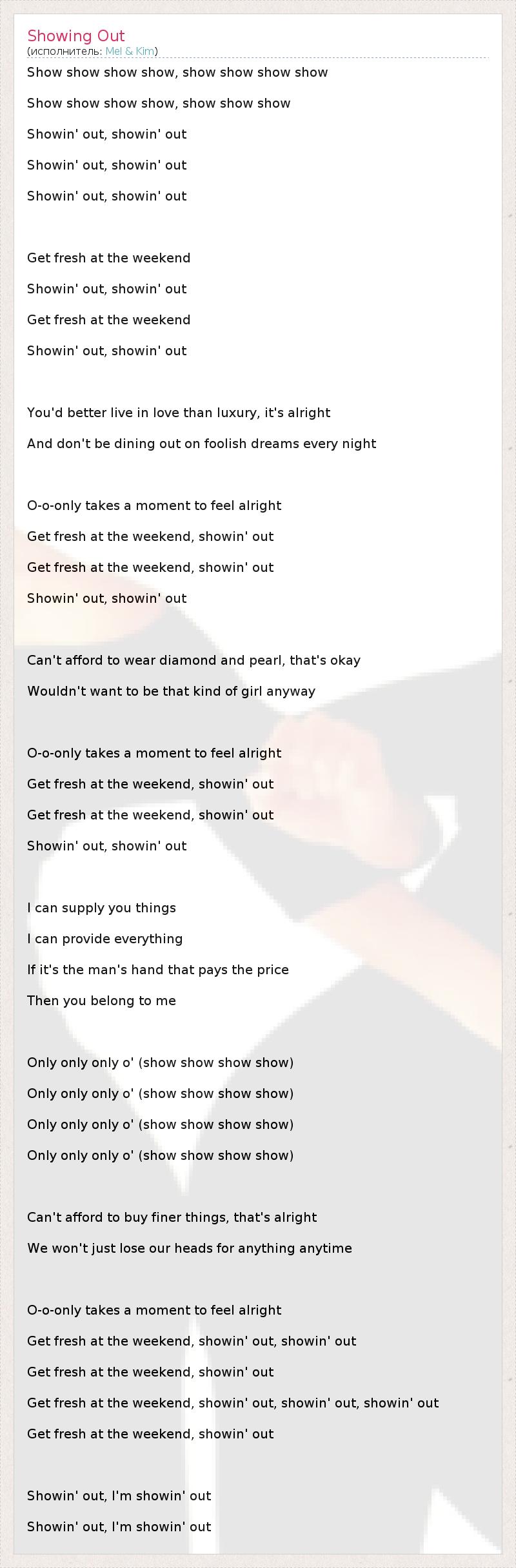 Get fresh at the weekend, showin' out, showin' out, showin' out