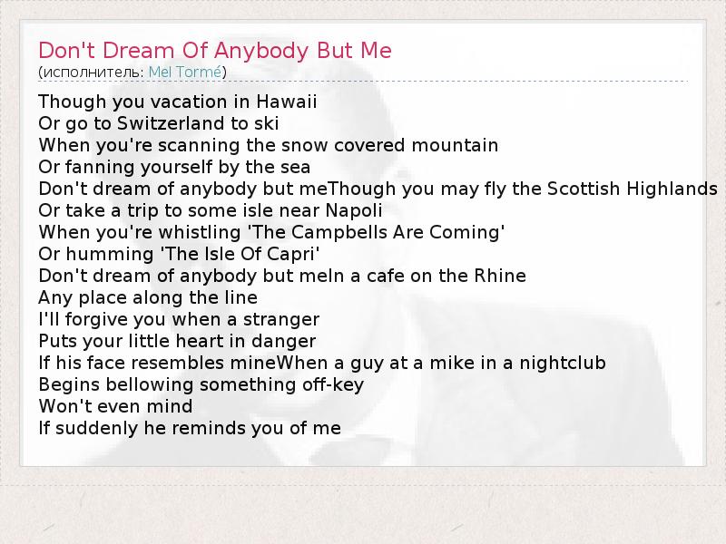 Though you vacation in Hawaii Or go to Switzerland to ski When you're scanning the snow covered mountain Or fanning yourself by the sea Don't dream of anybody but meThough you may fly the Scottish Highlands Or take a trip to some isle near Napoli When you're whistling 'The Campbells Are Coming' Or humming 'The Isle Of Capri' Don't dream of anybody but meIn a cafe on the Rhine Any place along the line I'll forgive you when a stranger Puts your little heart in danger If his face resembles mineWhen a guy at a mike in a nightclub Begins bellowing something off-key Won't even mind If suddenly he reminds you of me