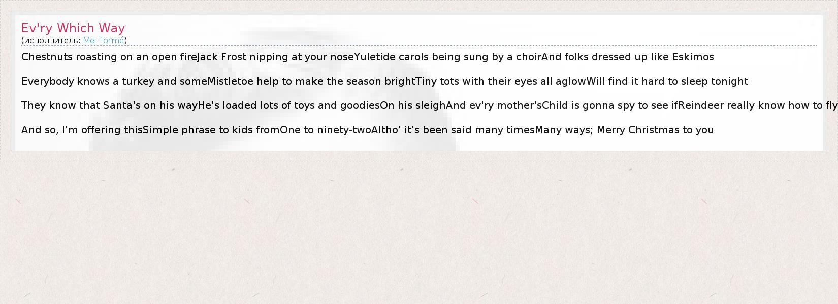 Chestnuts roasting on an open fireJack Frost nipping at your noseYuletide carols being sung by a choirAnd folks dressed up like Eskimos Everybody knows a turkey and someMistletoe help to make the season brightTiny tots with their eyes all aglowWill find it hard to sleep tonight They know that Santa's on his wayHe's loaded lots of toys and goodiesOn his sleighAnd ev'ry mother'sChild is gonna spy to see ifReindeer really know how to fly And so, I'm offering thisSimple phrase to kids fromOne to ninety-twoAltho' it's been said many timesMany ways; Merry Christmas to you