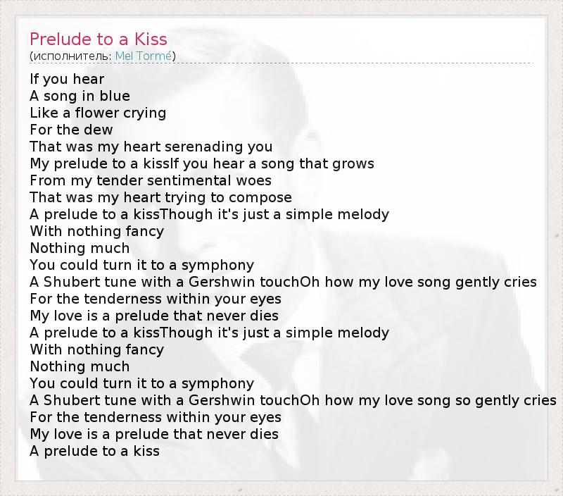 If you hear A song in blue Like a flower crying For the dew That was my heart serenading you My prelude to a kissIf you hear a song that grows From my tender sentimental woes That was my heart trying to compose A prelude to a kissThough it's just a simple melody With nothing fancy Nothing much You could turn it to a symphony A Shubert tune with a Gershwin touchOh how my love song gently cries For the tenderness within your eyes My love is a prelude that never dies A prelude to a kissThough it's just a simple melody With nothing fancy Nothing much You could turn it to a symphony A Shubert tune with a Gershwin touchOh how my love song so gently cries For the tenderness within your eyes My love is a prelude that never dies A prelude to a kiss