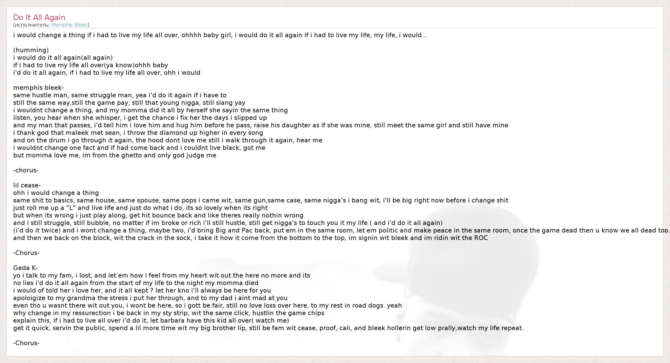 i would change a thing if i had to live my life all over, ohhhh baby girl, i would do it all again if i had to live my life, my life, i would... (humming) i would do it all again(all again) if i had to live my life all over(ya know)ohhh baby i'd do it all again, if i had to live my life all over, ohh i would memphis bleek- same hustle man, same struggle man, yea i'd do it again if i have to still the same way,still the game pay, still that young nigga, still slang yay i wouldnt change a thing, and my momma did it all by herself she sayin the same thing listen, you hear when she whisper, i get the chance i fix her the days i slipped up and my man that passes, i'd tell him i love him and hug him before he pass, raise his daughter as if she was mine, still meet the same girl and still have mine i thank god that maleek met sean, i throw the diamond up higher in every song and on the drum i go through it again, the hood dont love me still i walk through it again, hear me i wouldnt change one fact and if had come back and i couldnt live black, got me but momma love me, im from the ghetto and only god judge me -chorus- lil cease- ohh i would change a thing same shit to basics, same house, same spouse, same pops i came wit, same gun,same case, same nigga's i bang wit, i'll be big right now before i change shit just roll me up a "L" and live life and just do what i do, its so lovely when its right but when its wrong i just play along, get hit bounce back and like theres really nothin wrong and i still struggle, still bubble, no matter if im broke or rich i'll still hustle, still get nigga's to touch you it my life ( and i'd do it all again) (i'd do it twice) and i wont change a thing, maybe two, i'd bring Big and Pac back, put em in the same room, let em politic and make peace in the same room, once the game dead then u know we all dead too. and then we back on the block, wit the crack in the sock, i take it how it come from the bottom to the top, im signin wit bleek and im ridin wit the ROC -Chorus- Geda K- yo i talk to my fam, i lost, and let em how i feel from my heart wit out the here no more and its no lies i'd do it all again from the start of my life to the night my momma died i would of told her i love her, and it all kept ? let her kno i'll always be here for you apoloigize to my grandma the stress i put her through, and to my dad i aint mad at you even tho u wasnt there wit out you, i wont be here, so i gott be fair, still no love loss over here, to my rest in road dogs. yeah why change in my ressurection i be back in my sty strip, wit the same click, hustlin the game chips explain this, if i had to live all over i'd do it, let barbara have this kid all over( watch me) get it quick, servin the public, spend a lil more time wit my big brother lip, still be fam wit cease, proof, cali, and bleek hollerin get low prally,watch my life repeat. -Chorus-