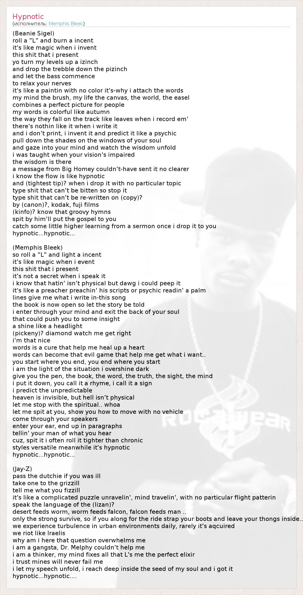 (Beanie Sigel) roll a "L" and burn a incent it's like magic when i invent this shit that i present yo turn my levels up a izinch and drop the trebble down the pizinch and let the bass commence to relax your nerves it's like a paintin with no color it's-why i attach the words my mind the brush, my life the canvas, the world, the easel combines a perfect picture for people my words is colorful like autumn the way they fall on the track like leaves when i record em' there's nothin like it when i write it and i don't print, i invent it and predict it like a psychic pull down the shades on the windows of your soul and gaze into your mind and watch the wisdom unfold i was taught when your vision's impaired the wisdom is there a message from Big Homey couldn't-have sent it no clearer i know the flow is like hypnotic and (tightest tip)? when i drop it with no particular topic type shit that can't be bitten so stop it type shit that can't be re-written on (copy)? by (canon)?, kodak, fuji films (kinfo)? know that groovy hymns spit by him'll put the gospel to you catch some little higher learning from a sermon once i drop it to you hypnotic...hypnotic... (Memphis Bleek) so roll a "L" and light a incent it's like magic when i event this shit that i present it's not a secret when i speak it i know that hatin' isn't physical but dawg i could peep it it's like a preacher preachin' his scripts or psychic readin' a palm lines give me what i write in-this song the book is now open so let the story be told i enter through your mind and exit the back of your soul that could push you to some insight a shine like a headlight (pickeny)? diamond watch me get right i'm that nice words is a cure that help me heal up a heart words can become that evil game that help me get what i want.. you start where you end, you end where you start i am the light of the situation i overshine dark give you the pen, the book, the word, the truth, the sight, the mind i put it down, you call it a rhyme, i call it a sign i predict the unpredictable heaven is invisible, but hell isn't physical let me stop with the spiritual.. whoa let me spit at you, show you how to move with no vehicle come through your speakers enter your ear, end up in paragraphs tellin' your man of what you hear cuz, spit it i often roll it tighter than chronic styles versatile meanwhile it's hypnotic hypnotic...hypnotic... (Jay-Z) pass the dutchie if you was ill take one to the grizzill tell me what you fizzill it's like a complicated puzzle unravelin', mind travelin', with no particular flight patterin speak the language of the (lizan)? desert feeds worm, worm feeds falcon, falcon feeds man .. only the strong survive, so if you along for the ride strap your boots and leave your thongs inside.. we experience turbulence in urban environments daily, rarely it's aqcuired we riot like Iraelis why am i here that question overwhelms me i am a gangsta, Dr. Melphy couldn't help me i am a thinker, my mind fixes all that L's me the perfect elixir i trust mines will never fail me i let my speech unfold, i reach deep inside the seed of my soul and i got it hypnotic...hypnotic....