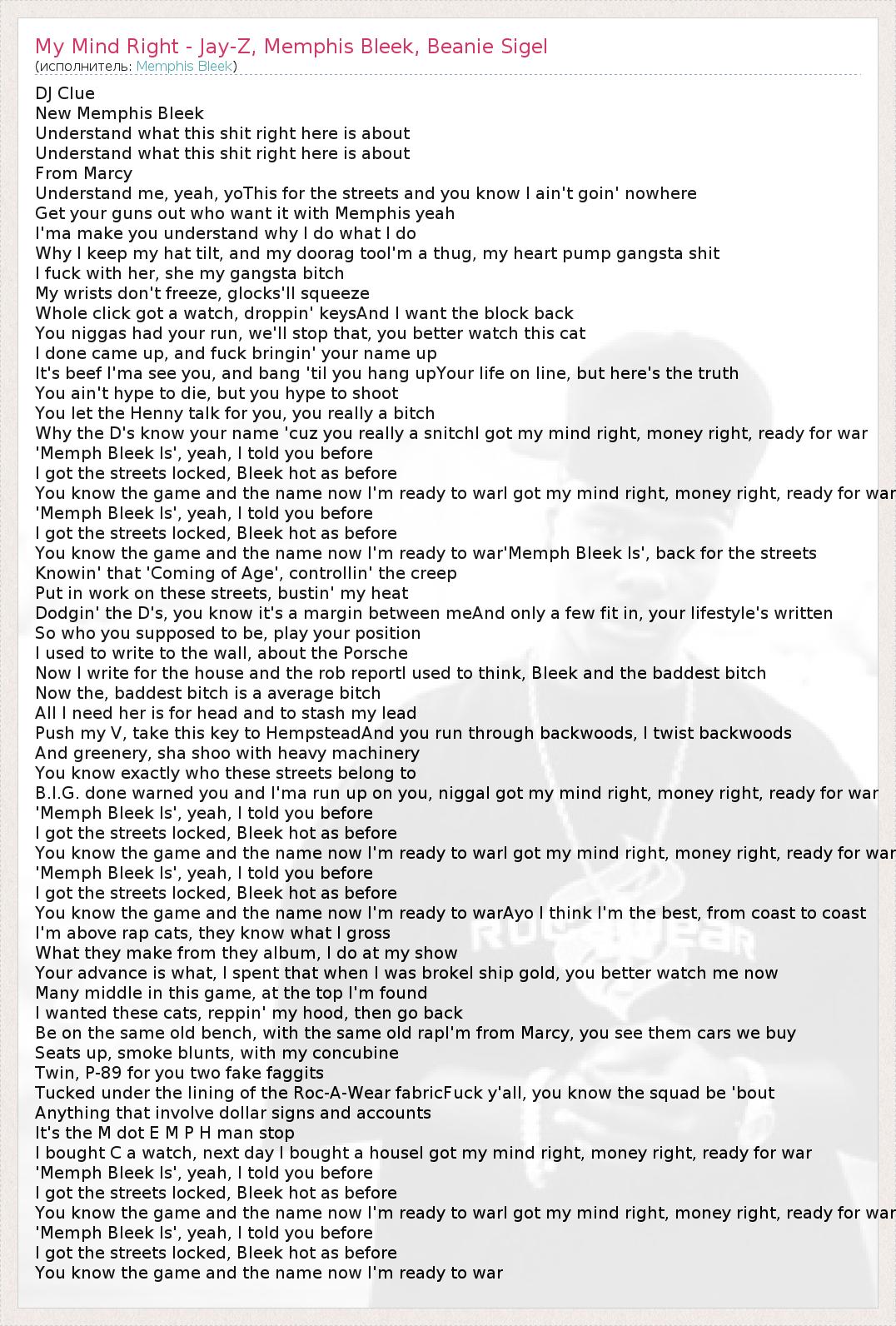 А как ты думаешь, о чем песня "My Mind Right - Jay-Z, Memphis Bleek, Beanie Sigel" ?