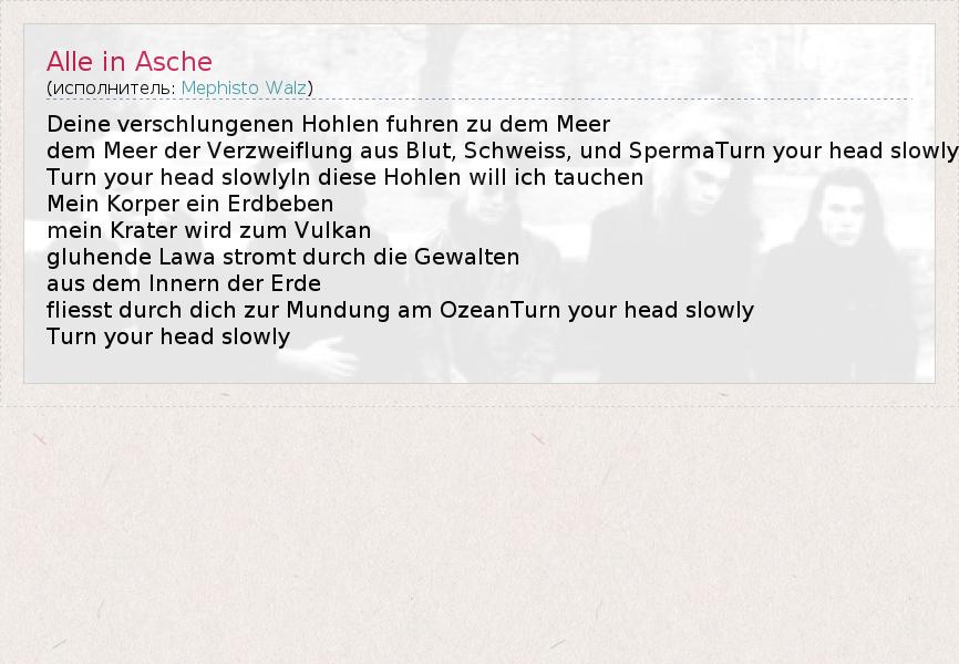 Deine verschlungenen Hohlen fuhren zu dem Meer dem Meer der Verzweiflung aus Blut, Schweiss, und SpermaTurn your head slowly Turn your head slowlyIn diese Hohlen will ich tauchen Mein Korper ein Erdbeben mein Krater wird zum Vulkan gluhende Lawa stromt durch die Gewalten aus dem Innern der Erde fliesst durch dich zur Mundung am OzeanTurn your head slowly Turn your head slowly