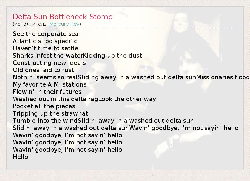 А как ты думаешь, о чем песня "Delta Sun Bottleneck Stomp" ?