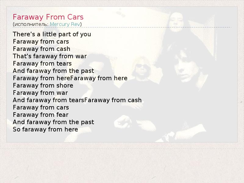 А как ты думаешь, о чем песня "Faraway From Cars" ?