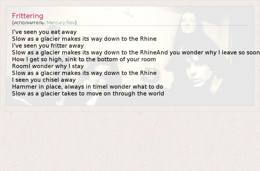 I've seen you eat away Slow as a glacier makes its way down to the Rhine I've seen you fritter away Slow as a glacier makes its way down to the RhineAnd you wonder why I leave so soon How I get so high, sink to the bottom of your room RoomI wonder why I stay Slow as a glacier makes its way down to the Rhine I seen you chisel away Hammer in place, always in timeI wonder what to do Slow as a glacier takes to move on through the world