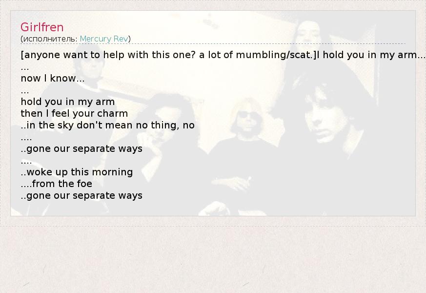 Это интересно:Не столько музыкальная группа, сколько длинное и довольно странное путешествие, растянувшееся почти на двадцать лет и не раз переживавшее периоды турбулентности и хаоса - вот что такое Mercury Rev с высоты сегодняшнего дня. "Изобретательная смесь Pink Floyd и Dinosaur Jr." - только одна из сетей, в которые пытались поймать Mercury Rev не менее изобретательные критики. Команда требовала специального... продолжение