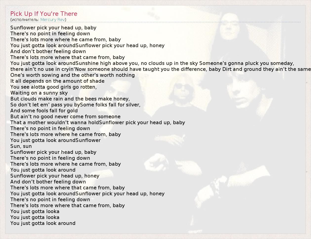 Sunflower pick your head up, baby There's no point in feeling down There's lots more where he came from, baby You just gotta look aroundSunflower pick your head up, honey And don't bother feeling down There's lots more where that came from, baby You just gotta look aroundSunshine high above you, no clouds up in the sky Someone's gonna pluck you someday, there ain't no use in cryin'Now someone should have taught you the difference, baby Dirt and ground they ain't the same One's worth sowing and the other's worth nothing It all depends on the amount of shade You see alotta good girls go rotten, Waiting on a sunny sky But clouds make rain and the bees make honey, So don't let em' pass you bySome folks fall for silver, And some fools fall for gold But ain't no good never come from someone That a mother wouldn't wanna holdSunflower pick your head up, baby There's no point in feeling down There's lots more where he came from, baby You just gotta look aroundSunflower Sun, sun Sunflower pick your head up, baby There's no point in feeling down There's lots more where he came from, baby You just gotta look around Sunflower pick your head up, honey And don't bother feeling down There's lots more where that came from, baby You just gotta look aroundSunflower pick your head up, honey There's no point in feeling down There's lots more where that came from, baby You just gotta looka You just gotta looka You just gotta look around