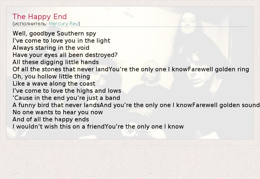 Это интересно:Не столько музыкальная группа, сколько длинное и довольно странное путешествие, растянувшееся почти на двадцать лет и не раз переживавшее периоды турбулентности и хаоса - вот что такое Mercury Rev с высоты сегодняшнего дня. "Изобретательная смесь Pink Floyd и Dinosaur Jr." - только одна из сетей, в которые пытались поймать Mercury Rev не менее изобретательные критики. Команда требовала специального... продолжение