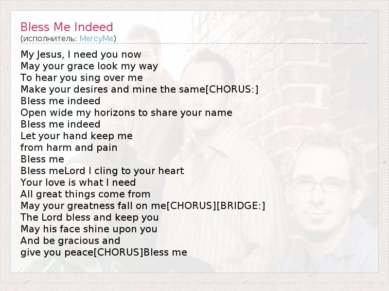 My Jesus, I need you now May your grace look my way To hear you sing over me Make your desires and mine the same[CHORUS:] Bless me indeed Open wide my horizons to share your name Bless me indeed Let your hand keep me from harm and pain Bless me Bless meLord I cling to your heart Your love is what I need All great things come from May your greatness fall on me[CHORUS][BRIDGE:] The Lord bless and keep you May his face shine upon you And be gracious and give you peace[CHORUS]Bless me