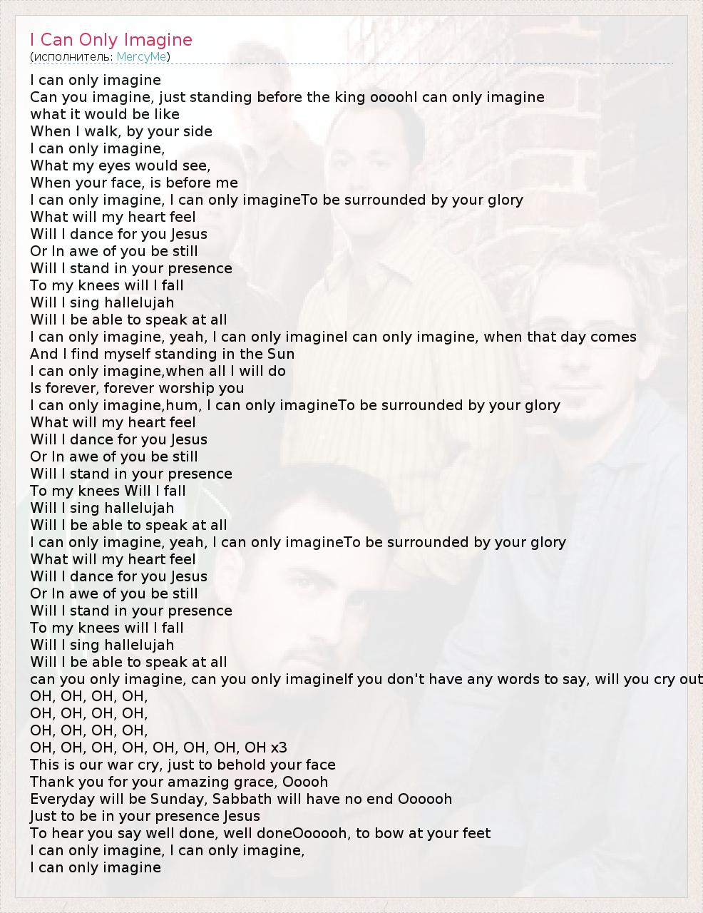I can only imagine Can you imagine, just standing before the king oooohI can only imagine what it would be like When I walk, by your side I can only imagine, What my eyes would see, When your face, is before me I can only imagine, I can only imagineTo be surrounded by your glory What will my heart feel Will I dance for you Jesus Or In awe of you be still Will I stand in your presence To my knees will I fall Will I sing hallelujah Will I be able to speak at all I can only imagine, yeah, I can only imagineI can only imagine, when that day comes And I find myself standing in the Sun I can only imagine,when all I will do Is forever, forever worship you I can only imagine,hum, I can only imagineTo be surrounded by your glory What will my heart feel Will I dance for you Jesus Or In awe of you be still Will I stand in your presence To my knees Will I fall Will I sing hallelujah Will I be able to speak at all I can only imagine, yeah, I can only imagineTo be surrounded by your glory What will my heart feel Will I dance for you Jesus Or In awe of you be still Will I stand in your presence To my knees will I fall Will I sing hallelujah Will I be able to speak at all can you only imagine, can you only imagineIf you don't have any words to say, will you cry out OH, OH, OH, OH, OH, OH, OH, OH, OH, OH, OH, OH, OH, OH, OH, OH, OH, OH, OH, OH x3 This is our war cry, just to behold your face Thank you for your amazing grace, Ooooh Everyday will be Sunday, Sabbath will have no end Oooooh Just to be in your presence Jesus To hear you say well done, well doneOooooh, to bow at your feet I can only imagine, I can only imagine, I can only imagine