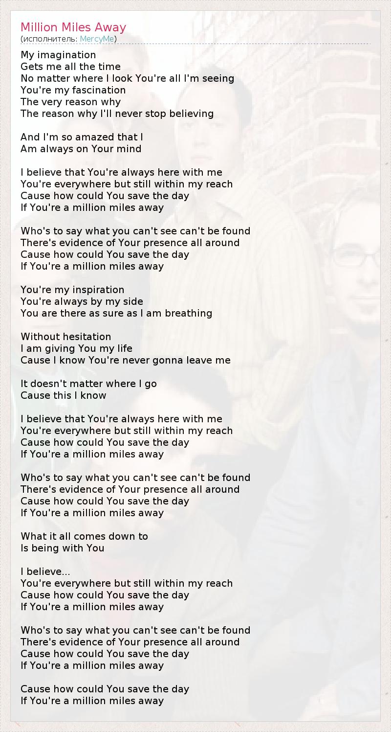 My imagination Gets me all the time No matter where I look You're all I'm seeing You're my fascination The very reason why The reason why I'll never stop believing And I'm so amazed that I Am always on Your mind I believe that You're always here with me You're everywhere but still within my reach Cause how could You save the day If You're a million miles away Who's to say what you can't see can't be found There's evidence of Your presence all around Cause how could You save the day If You're a million miles away You're my inspiration You're always by my side You are there as sure as I am breathing Without hesitation I am giving You my life Cause I know You're never gonna leave me It doesn't matter where I go Cause this I know I believe that You're always here with me You're everywhere but still within my reach Cause how could You save the day If You're a million miles away Who's to say what you can't see can't be found There's evidence of Your presence all around Cause how could You save the day If You're a million miles away What it all comes down to Is being with You I believe... You're everywhere but still within my reach Cause how could You save the day If You're a million miles away Who's to say what you can't see can't be found There's evidence of Your presence all around Cause how could You save the day If You're a million miles away Cause how could You save the day If You're a million miles away