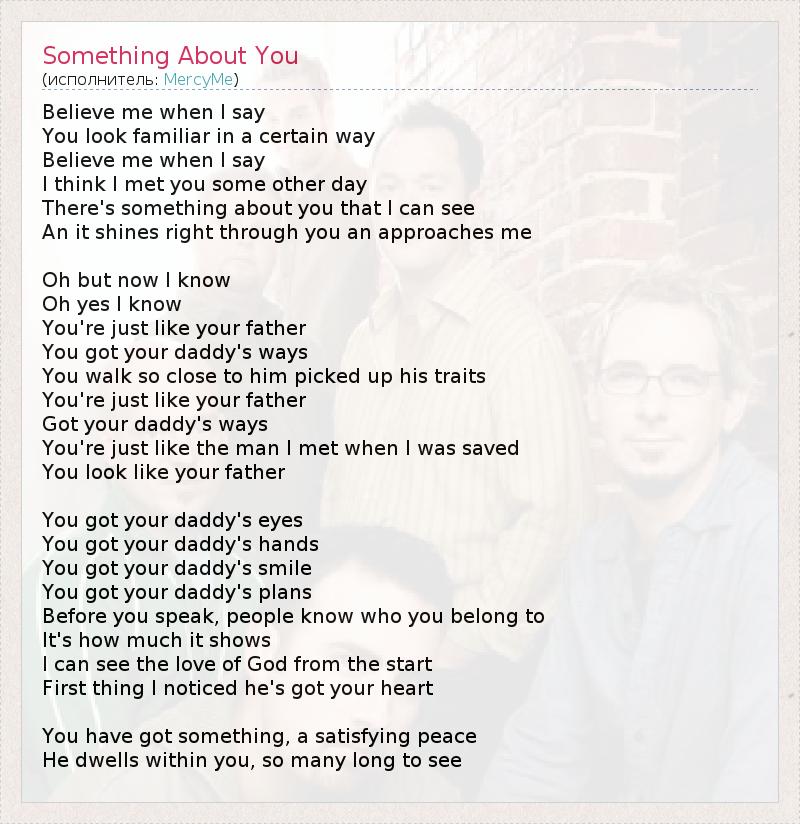 Believe me when I say You look familiar in a certain way Believe me when I say I think I met you some other day There's something about you that I can see An it shines right through you an approaches me Oh but now I know Oh yes I know You're just like your father You got your daddy's ways You walk so close to him picked up his traits You're just like your father Got your daddy's ways You're just like the man I met when I was saved You look like your father You got your daddy's eyes You got your daddy's hands You got your daddy's smile You got your daddy's plans Before you speak, people know who you belong to It's how much it shows I can see the love of God from the start First thing I noticed he's got your heart You have got something, a satisfying peace He dwells within you, so many long to see
