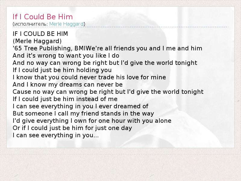 IF I COULD BE HIM (Merle Haggard) '65 Tree Publishing, BMIWe're all friends you and I me and him And it's wrong to want you like I do And no way can wrong be right but I'd give the world tonight If I could just be him holding you I know that you could never trade his love for mine And I know my dreams can never be Cause no way can wrong be right but I'd give the world tonight If I could just be him instead of me I can see everything in you I ever dreamed of But someone I call my friend stands in the way I'd give everything I own for one hour with you alone Or if I could just be him for just one day I can see everything in you...