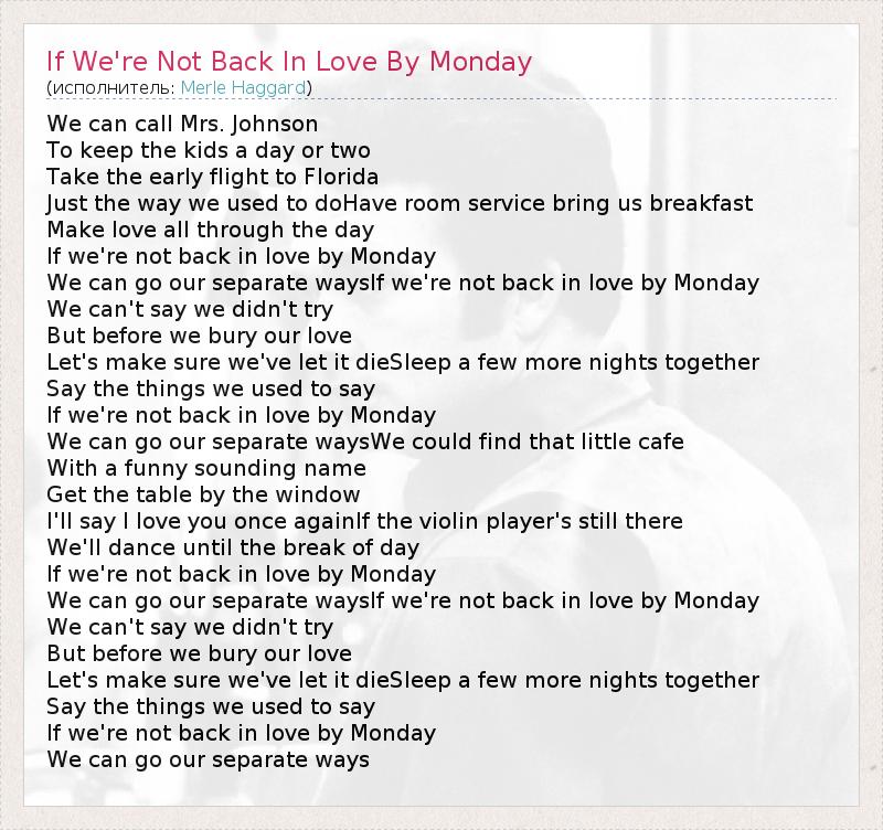 We can call Mrs. Johnson To keep the kids a day or two Take the early flight to Florida Just the way we used to doHave room service bring us breakfast Make love all through the day If we're not back in love by Monday We can go our separate waysIf we're not back in love by Monday We can't say we didn't try But before we bury our love Let's make sure we've let it dieSleep a few more nights together Say the things we used to say If we're not back in love by Monday We can go our separate waysWe could find that little cafe With a funny sounding name Get the table by the window I'll say I love you once againIf the violin player's still there We'll dance until the break of day If we're not back in love by Monday We can go our separate waysIf we're not back in love by Monday We can't say we didn't try But before we bury our love Let's make sure we've let it dieSleep a few more nights together Say the things we used to say If we're not back in love by Monday We can go our separate ways