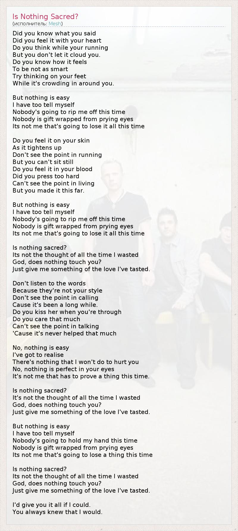 Did you know what you said Did you feel it with your heart Do you think while your running But you don't let it cloud you. Do you know how it feels To be not as smart Try thinking on your feet While it's crowding in around you. But nothing is easy I have too tell myself Nobody's going to rip me off this time Nobody is gift wrapped from prying eyes Its not me that's going to lose it all this time Do you feel it on your skin As it tightens up Don't see the point in running But you can't sit still Do you feel it in your blood Did you press too hard Can't see the point in living But you made it this far. But nothing is easy I have too tell myself Nobody's going to rip me off this time Nobody is gift wrapped from prying eyes Its not me that's going to lose it all this time Is nothing sacred? Its not the thought of all the time I wasted God, does nothing touch you? Just give me something of the love I've tasted. Don't listen to the words Because they're not your style Don't see the point in calling Cause it's been a long while. Do you kiss her when you're through Do you care that much Can't see the point in talking 'Cause it's never helped that much No, nothing is easy I've got to realise There's nothing that I won't do to hurt you No, nothing is perfect in your eyes It's not me that has to prove a thing this time. Is nothing sacred? It's not the thought of all the time I wasted God, does nothing touch you? Just give me something of the love I've tasted. But nothing is easy I have too tell myself Nobody's going to hold my hand this time Nobody is gift wrapped from prying eyes Its not me that's going to lose a thing this time Is nothing sacred? Its not the thought of all the time I wasted God, does nothing touch you? Just give me something of the love I've tasted. I'd give you it all if I could. You always knew that I would.