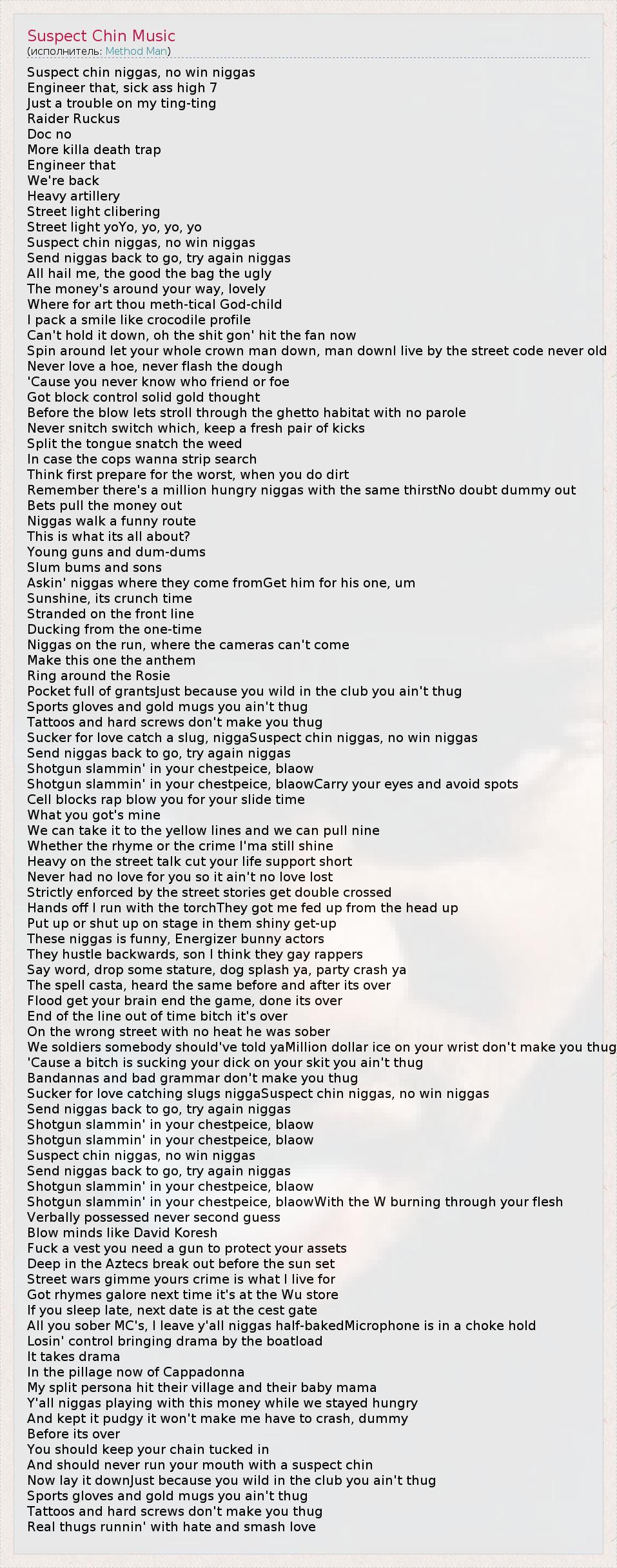 Suspect chin niggas, no win niggas Engineer that, sick ass high 7 Just a trouble on my ting-ting Raider Ruckus Doc no More killa death trap Engineer that We're back Heavy artillery Street light clibering Street light yoYo, yo, yo, yo Suspect chin niggas, no win niggas Send niggas back to go, try again niggas All hail me, the good the bag the ugly The money's around your way, lovely Where for art thou meth-tical God-child I pack a smile like crocodile profile Can't hold it down, oh the shit gon' hit the fan now Spin around let your whole crown man down, man downI live by the street code never old Never love a hoe, never flash the dough 'Cause you never know who friend or foe Got block control solid gold thought Before the blow lets stroll through the ghetto habitat with no parole Never snitch switch which, keep a fresh pair of kicks Split the tongue snatch the weed In case the cops wanna strip search Think first prepare for the worst, when you do dirt Remember there's a million hungry niggas with the same thirstNo doubt dummy out Bets pull the money out Niggas walk a funny route This is what its all about? Young guns and dum-dums Slum bums and sons Askin' niggas where they come fromGet him for his one, um Sunshine, its crunch time Stranded on the front line Ducking from the one-time Niggas on the run, where the cameras can't come Make this one the anthem Ring around the Rosie Pocket full of grantsJust because you wild in the club you ain't thug Sports gloves and gold mugs you ain't thug Tattoos and hard screws don't make you thug Sucker for love catch a slug, niggaSuspect chin niggas, no win niggas Send niggas back to go, try again niggas Shotgun slammin' in your chestpeice, blaow Shotgun slammin' in your chestpeice, blaowCarry your eyes and avoid spots Cell blocks rap blow you for your slide time What you got's mine We can take it to the yellow lines and we can pull nine Whether the rhyme or the crime I'ma still shine Heavy on the street talk cut your life support short Never had no love for you so it ain't no love lost Strictly enforced by the street stories get double crossed Hands off I run with the torchThey got me fed up from the head up Put up or shut up on stage in them shiny get-up These niggas is funny, Energizer bunny actors They hustle backwards, son I think they gay rappers Say word, drop some stature, dog splash ya, party crash ya The spell casta, heard the same before and after its over Flood get your brain end the game, done its over End of the line out of time bitch it's over On the wrong street with no heat he was sober We soldiers somebody should've told yaMillion dollar ice on your wrist don't make you thug 'Cause a bitch is sucking your dick on your skit you ain't thug Bandannas and bad grammar don't make you thug Sucker for love catching slugs niggaSuspect chin niggas, no win niggas Send niggas back to go, try again niggas Shotgun slammin' in your chestpeice, blaow Shotgun slammin' in your chestpeice, blaow Suspect chin niggas, no win niggas Send niggas back to go, try again niggas Shotgun slammin' in your chestpeice, blaow Shotgun slammin' in your chestpeice, blaowWith the W burning through your flesh Verbally possessed never second guess Blow minds like David Koresh Fuck a vest you need a gun to protect your assets Deep in the Aztecs break out before the sun set Street wars gimme yours crime is what I live for Got rhymes galore next time it's at the Wu store If you sleep late, next date is at the cest gate All you sober MC's, I leave y'all niggas half-bakedMicrophone is in a choke hold Losin' control bringing drama by the boatload It takes drama In the pillage now of Cappadonna My split persona hit their village and their baby mama Y'all niggas playing with this money while we stayed hungry And kept it pudgy it won't make me have to crash, dummy Before its over You should keep your chain tucked in And should never run your mouth with a suspect chin Now lay it downJust because you wild in the club you ain't thug Sports gloves and gold mugs you ain't thug Tattoos and hard screws don't make you thug Real thugs runnin' with hate and smash love