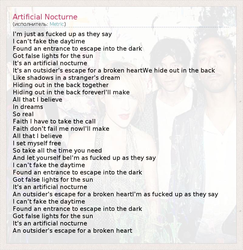 I'm just as fucked up as they say I can't fake the daytime Found an entrance to escape into the dark Got false lights for the sun It's an artificial nocturne It's an outsider's escape for a broken heartWe hide out in the back Like shadows in a stranger's dream Hiding out in the back together Hiding out in the back foreverI'll make All that I believe In dreams So real Faith I have to take the call Faith don't fail me nowI'll make All that I believe I set myself free So take all the time you need And let yourself beI'm as fucked up as they say I can't fake the daytime Found an entrance to escape into the dark Got false lights for the sun It's an artificial nocturne An outsider's escape for a broken heartI'm as fucked up as they say I can't fake the daytime Found an entrance to escape into the dark Got false lights for the sun It's an artificial nocturne An outsider's escape for a broken heart