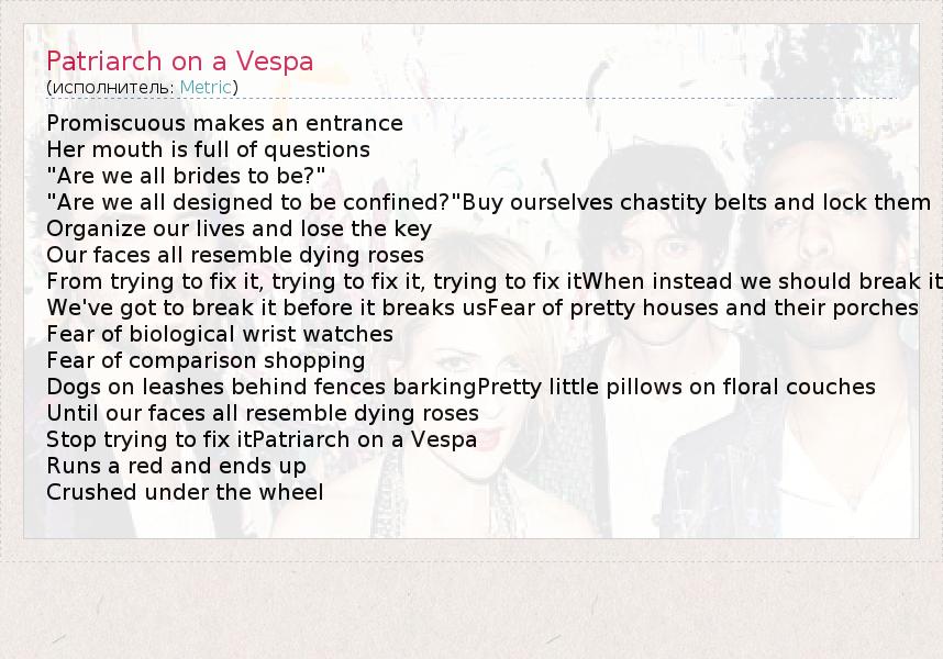 А как ты думаешь, о чем песня "Patriarch on a Vespa" ?