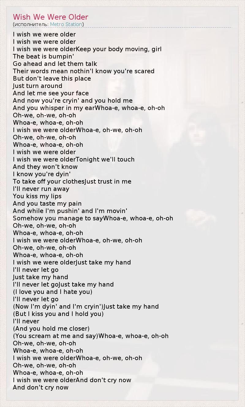 I wish we were older I wish we were older I wish we were olderKeep your body moving, girl The beat is bumpin' Go ahead and let them talk Their words mean nothin'I know you're scared But don't leave this place Just turn around And let me see your face And now you're cryin' and you hold me And you whisper in my earWhoa-e, whoa-e, oh-oh Oh-we, oh-we, oh-oh Whoa-e, whoa-e, oh-oh I wish we were olderWhoa-e, oh-we, oh-oh Oh-we, oh-we, oh-oh Whoa-e, whoa-e, oh-oh I wish we were older I wish we were olderTonight we'll touch And they won't know I know you're dyin' To take off your clothesJust trust in me I'll never run away You kiss my lips And you taste my pain And while I'm pushin' and I'm movin' Somehow you manage to sayWhoa-e, whoa-e, oh-oh Oh-we, oh-we, oh-oh Whoa-e, whoa-e, oh-oh I wish we were olderWhoa-e, oh-we, oh-oh Oh-we, oh-we, oh-oh Whoa-e, whoa-e, oh-oh I wish we were olderJust take my hand I'll never let go Just take my hand I'll never let goJust take my hand (I love you and I hate you) I'll never let go (Now I'm dyin' and I'm cryin')Just take my hand (But I kiss you and I hold you) I'll never (And you hold me closer) (You scream at me and say)Whoa-e, whoa-e, oh-oh Oh-we, oh-we, oh-oh Whoa-e, whoa-e, oh-oh I wish we were olderWhoa-e, oh-we, oh-oh Oh-we, oh-we, oh-oh Whoa-e, whoa-e, oh-oh I wish we were olderAnd don't cry now And don't cry now