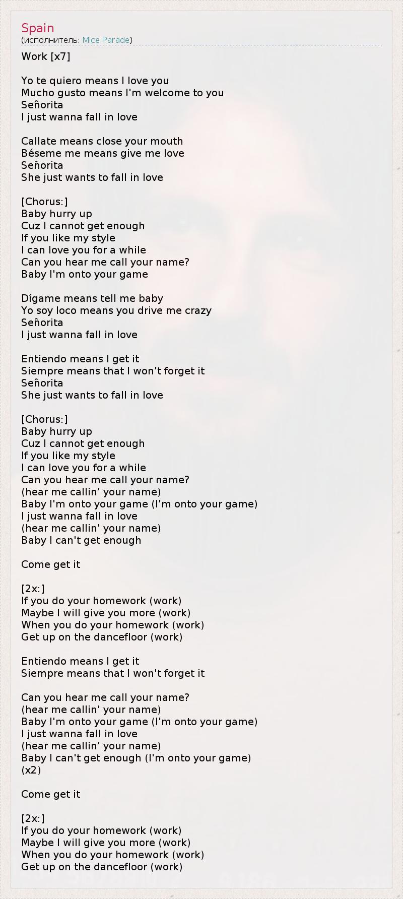 Work [x7] Yo te quiero means I love you Mucho gusto means I'm welcome to you Señorita I just wanna fall in love Callate means close your mouth Béseme me means give me love Señorita She just wants to fall in love [Chorus:] Baby hurry up Cuz I cannot get enough If you like my style I can love you for a while Can you hear me call your name? Baby I'm onto your game Dígame means tell me baby Yo soy loco means you drive me crazy Señorita I just wanna fall in love Entiendo means I get it Siempre means that I won't forget it Señorita She just wants to fall in love [Chorus:] Baby hurry up Cuz I cannot get enough If you like my style I can love you for a while Can you hear me call your name? (hear me callin' your name) Baby I'm onto your game (I'm onto your game) I just wanna fall in love (hear me callin' your name) Baby I can't get enough Come get it [2x:] If you do your homework (work) Maybe I will give you more (work) When you do your homework (work) Get up on the dancefloor (work) Entiendo means I get it Siempre means that I won't forget it Can you hear me call your name? (hear me callin' your name) Baby I'm onto your game (I'm onto your game) I just wanna fall in love (hear me callin' your name) Baby I can't get enough (I'm onto your game) (x2) Come get it [2x:] If you do your homework (work) Maybe I will give you more (work) When you do your homework (work) Get up on the dancefloor (work)