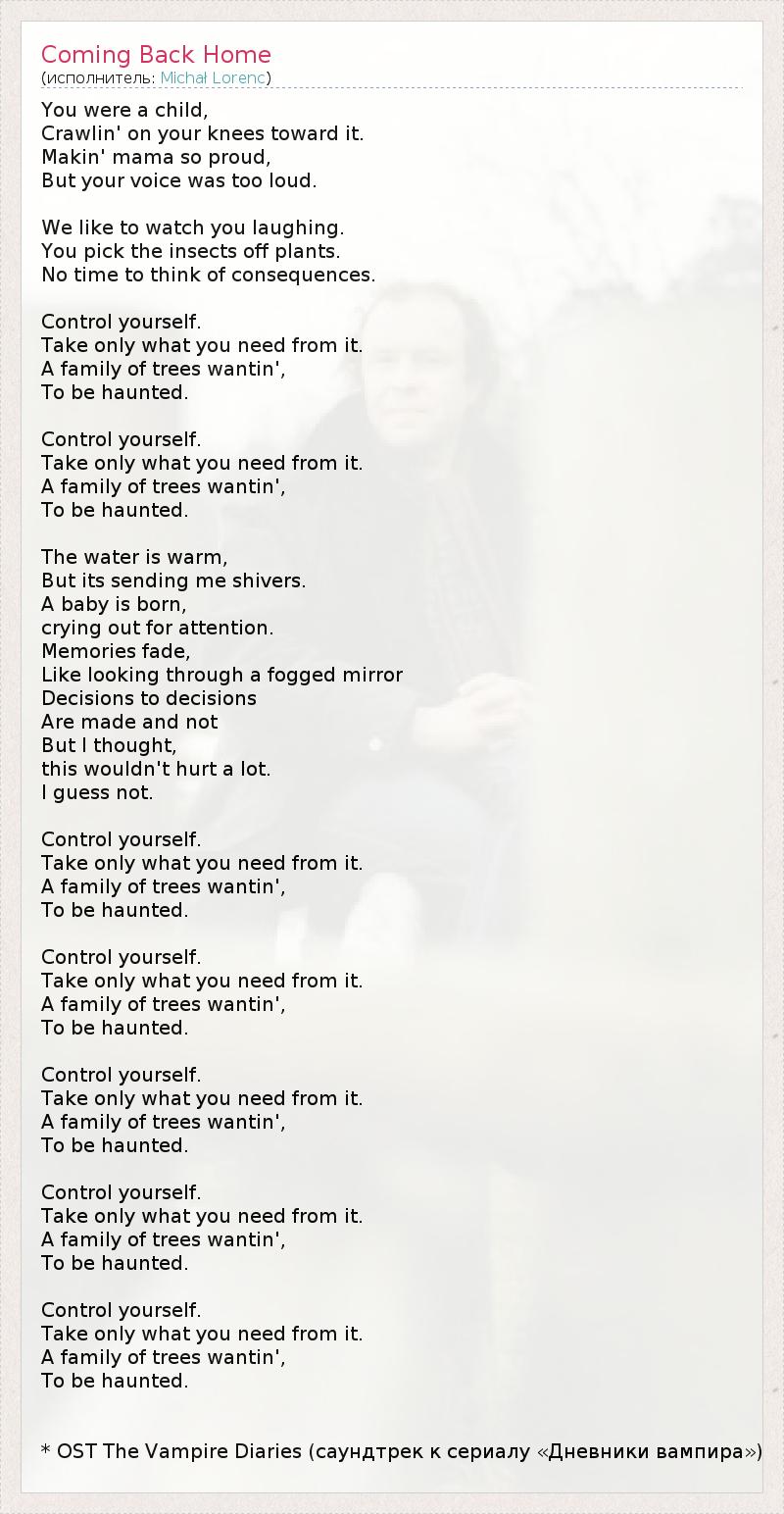 You were a child, Crawlin' on your knees toward it. Makin' mama so proud, But your voice was too loud. We like to watch you laughing. You pick the insects off plants. No time to think of consequences. Control yourself. Take only what you need from it. A family of trees wantin', To be haunted. Control yourself. Take only what you need from it. A family of trees wantin', To be haunted. The water is warm, But its sending me shivers. A baby is born, crying out for attention. Memories fade, Like looking through a fogged mirror Decisions to decisions Are made and not But I thought, this wouldn't hurt a lot. I guess not. Control yourself. Take only what you need from it. A family of trees wantin', To be haunted. Control yourself. Take only what you need from it. A family of trees wantin', To be haunted. Control yourself. Take only what you need from it. A family of trees wantin', To be haunted. Control yourself. Take only what you need from it. A family of trees wantin', To be haunted. Control yourself. Take only what you need from it. A family of trees wantin', To be haunted. * OST The Vampire Diaries (саундтрек к сериалу «Дневники вампира»)