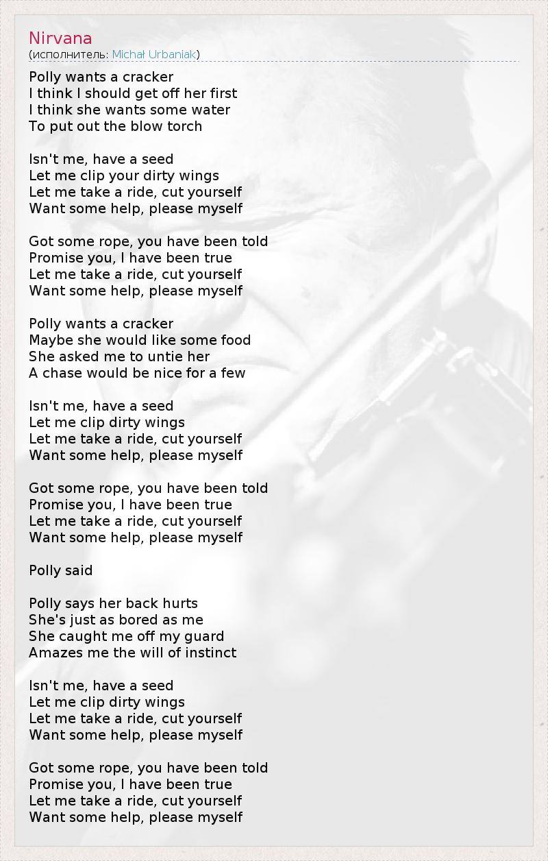 Крошка Полли хочет печеньице, - А я думаю, что сначала должен получить огромное удовольствие. Пожалуй, ей бы не помешало немного воды, Чтобы погасить мою паяльную лампу... Она - не я; прими моё семя, Позволь мне обрезать твои грязные крылышки. Позволь мне проехаться верхом, рассеки себя, Я хочу, чтобы ты помогла мне развлечься... У меня есть веревка, - я уже говорил тебе... Уверяю тебя - я был честен. Позволь мне проехаться верхом, рассеки себя, Я хочу, чтобы ты помогла мне развлечься... Крошка Полли хочет печеньице, Может, ей бы хотелось поесть. Она попросила, чтобы я развязал ее... Кое-кому понравилось бы преследование. Она - не я; прими моё семя, Позволь мне обрезать твои грязные крылышки. Позволь мне проехаться верхом, рассеки себя, Я хочу, чтобы ты помогла мне развлечься... У меня есть веревка, - я уже говорил тебе... Уверяю тебя - я был честен. Позволь мне проехаться верхом, рассеки себя, Я хочу, чтобы ты помогла мне развлечься... Полли сказала... Полли говорит, что у нее болит спина, Что ей так же скучно, как и мне. Она застигла меня врасплох; Воля инстинкта забавляет меня. Она - не я; прими моё семя, Позволь мне обрезать твои грязные крылышки. Позволь мне проехаться верхом, рассеки себя, Я хочу, чтобы ты помогла мне развлечься... У меня есть веревка, - я уже говорил тебе... Уверяю тебя - я был честен. Позволь мне проехаться верхом, рассеки себя, Я хочу, чтобы ты помогла мне развлечься... * Песня ведется от лица маньяка Дж. Френда, похитившего 14-летнюю девушку, возвращавшуюся с рок-концерта, и несколько дней пытавшего ее в своем фургоне. В конце концов, ей удалось сбежать на автостоянке. Участники Nirvana не раз утверждали, что эта песня направлена против насилия в целом.