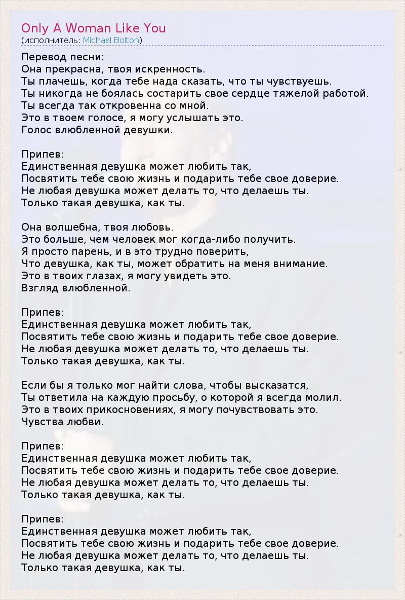 Перевод песни: Она прекрасна, твоя искренность. Ты плачешь, когда тебе нада сказать, что ты чувствуешь. Ты никогда не боялась состарить свое сердце тяжелой работой. Ты всегда так откровенна со мной. Это в твоем голосе, я могу услышать это. Голос влюбленной девушки. Припев: Единственная девушка может любить так, Посвятить тебе свою жизнь и подарить тебе свое доверие. Не любая девушка может делать то, что делаешь ты. Только такая девушка, как ты. Она волшебна, твоя любовь. Это больше, чем человек мог когда-либо получить. Я просто парень, и в это трудно поверить, Что девушка, как ты, может обратить на меня внимание. Это в твоих глазах, я могу увидеть это. Взгляд влюбленной. Припев: Единственная девушка может любить так, Посвятить тебе свою жизнь и подарить тебе свое доверие. Не любая девушка может делать то, что делаешь ты. Только такая девушка, как ты. Если бы я только мог найти слова, чтобы высказатся, Ты ответила на каждую просьбу, о которой я всегда молил. Это в твоих прикосновениях, я могу почувствовать это. Чувства любви. Припев: Единственная девушка может любить так, Посвятить тебе свою жизнь и подарить тебе свое доверие. Не любая девушка может делать то, что делаешь ты. Только такая девушка, как ты. Припев: Единственная девушка может любить так, Посвятить тебе свою жизнь и подарить тебе свое доверие. Не любая девушка может делать то, что делаешь ты. Только такая девушка, как ты.