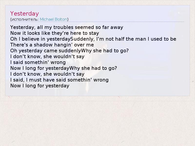 Oh I believe in yesterdaySuddenly, I'm not half the man I used to be