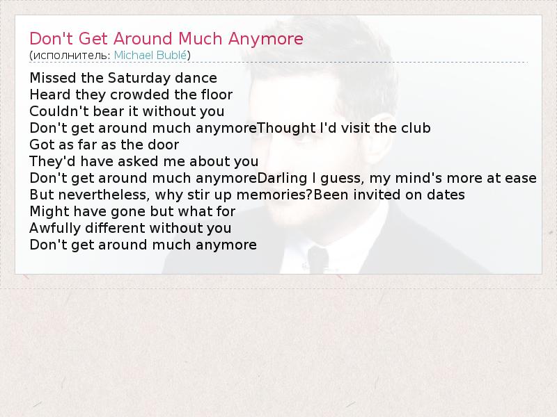 Missed the Saturday dance Heard they crowded the floor Couldn't bear it without you Don't get around much anymoreThought I'd visit the club Got as far as the door They'd have asked me about you Don't get around much anymoreDarling I guess, my mind's more at ease But nevertheless, why stir up memories?Been invited on dates Might have gone but what for Awfully different without you Don't get around much anymore