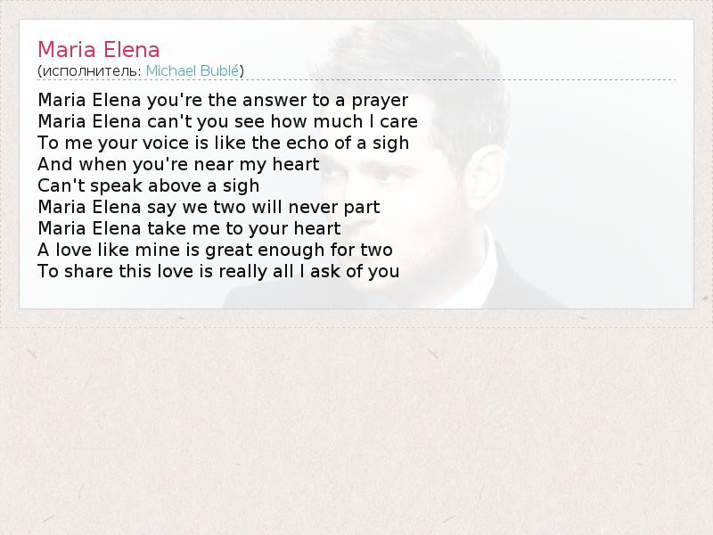 Maria Elena you're the answer to a prayer Maria Elena can't you see how much I care To me your voice is like the echo of a sigh And when you're near my heart Can't speak above a sigh Maria Elena say we two will never part Maria Elena take me to your heart A love like mine is great enough for two To share this love is really all I ask of you