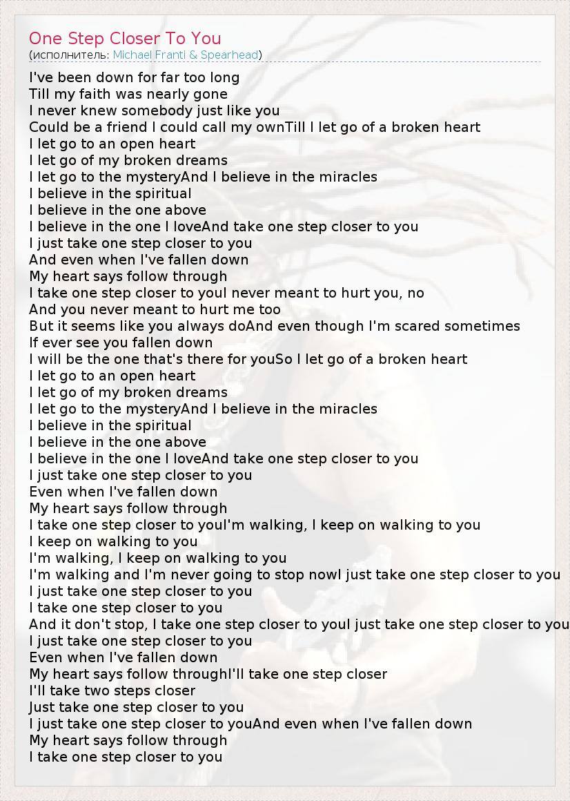 I'm walking and I'm never going to stop nowI just take one step closer to you