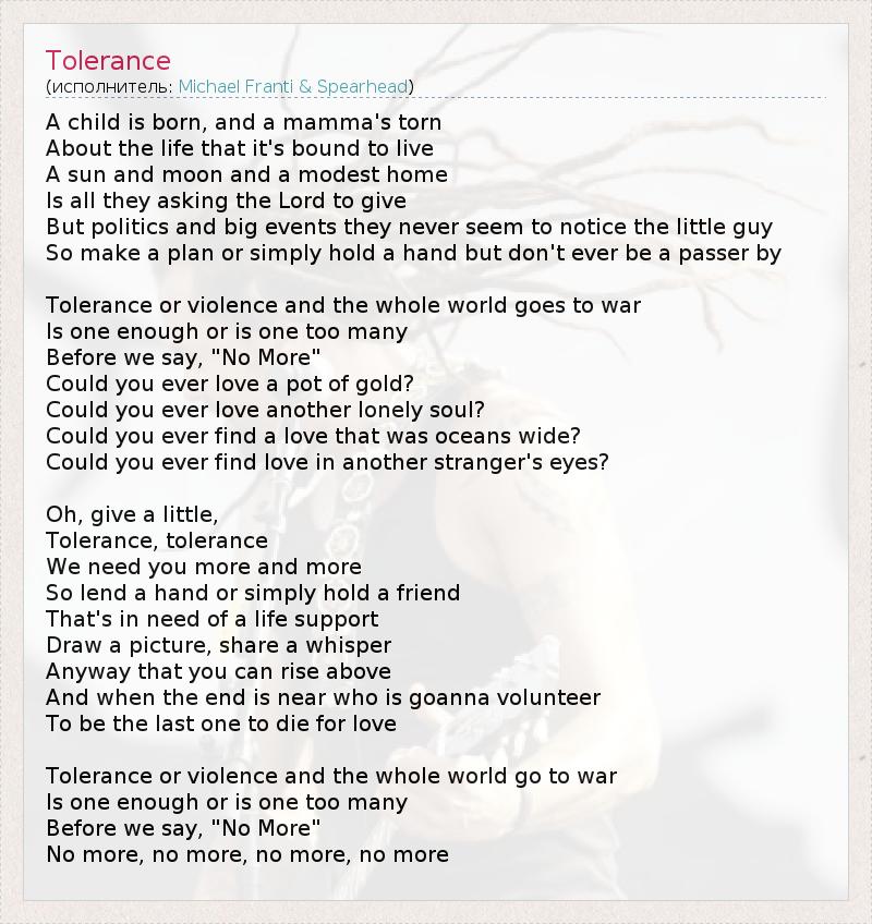 A child is born, and a mamma's torn About the life that it's bound to live A sun and moon and a modest home Is all they asking the Lord to give But politics and big events they never seem to notice the little guy So make a plan or simply hold a hand but don't ever be a passer by Tolerance or violence and the whole world goes to war Is one enough or is one too many Before we say, "No More" Could you ever love a pot of gold? Could you ever love another lonely soul? Could you ever find a love that was oceans wide? Could you ever find love in another stranger's eyes? Oh, give a little, Tolerance, tolerance We need you more and more So lend a hand or simply hold a friend That's in need of a life support Draw a picture, share a whisper Anyway that you can rise above And when the end is near who is goanna volunteer To be the last one to die for love Tolerance or violence and the whole world go to war Is one enough or is one too many Before we say, "No More" No more, no more, no more, no more