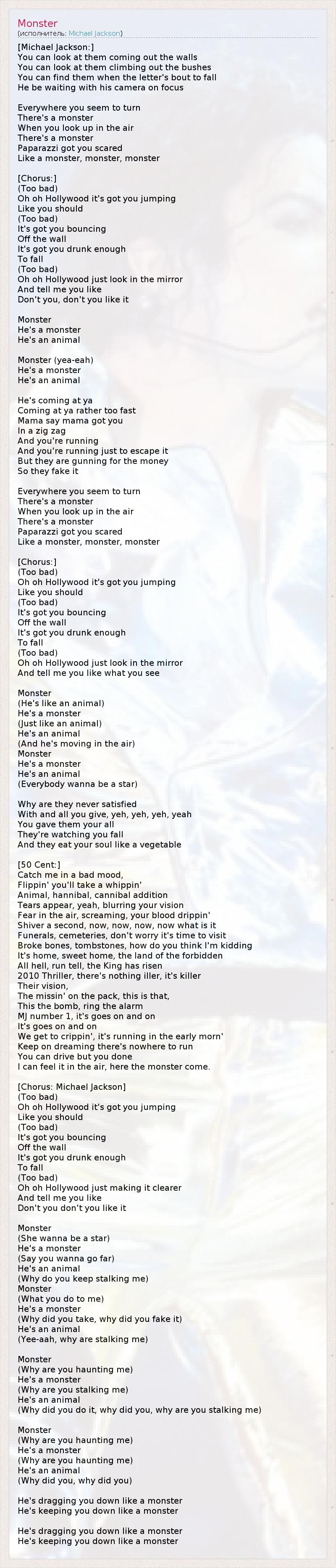[Michael Jackson:] You can look at them coming out the walls You can look at them climbing out the bushes You can find them when the letter's bout to fall He be waiting with his camera on focus Everywhere you seem to turn There's a monster When you look up in the air There's a monster Paparazzi got you scared Like a monster, monster, monster [Chorus:] (Too bad) Oh oh Hollywood it's got you jumping Like you should (Too bad) It's got you bouncing Off the wall It's got you drunk enough To fall (Too bad) Oh oh Hollywood just look in the mirror And tell me you like Don't you, don't you like it Monster He's a monster He's an animal Monster (yea-eah) He's a monster He's an animal He's coming at ya Coming at ya rather too fast Mama say mama got you In a zig zag And you're running And you're running just to escape it But they are gunning for the money So they fake it Everywhere you seem to turn There's a monster When you look up in the air There's a monster Paparazzi got you scared Like a monster, monster, monster [Chorus:] (Too bad) Oh oh Hollywood it's got you jumping Like you should (Too bad) It's got you bouncing Off the wall It's got you drunk enough To fall (Too bad) Oh oh Hollywood just look in the mirror And tell me you like what you see Monster (He's like an animal) He's a monster (Just like an animal) He's an animal (And he's moving in the air) Monster He's a monster He's an animal (Everybody wanna be a star) Why are they never satisfied With and all you give, yeh, yeh, yeh, yeah You gave them your all They're watching you fall And they eat your soul like a vegetable [50 Cent:] Catch me in a bad mood, Flippin' you'll take a whippin' Animal, hannibal, cannibal addition Tears appear, yeah, blurring your vision Fear in the air, screaming, your blood drippin' Shiver a second, now, now, now, now what is it Funerals, cemeteries, don't worry it's time to visit Broke bones, tombstones, how do you think I'm kidding It's home, sweet home, the land of the forbidden All hell, run tell, the King has risen 2010 Thriller, there's nothing iller, it's killer Their vision, The missin' on the pack, this is that, This the bomb, ring the alarm MJ number 1, it's goes on and on It's goes on and on We get to crippin', it's running in the early morn' Keep on dreaming there's nowhere to run You can drive but you done I can feel it in the air, here the monster come. [Chorus: Michael Jackson] (Too bad) Oh oh Hollywood it's got you jumping Like you should (Too bad) It's got you bouncing Off the wall It's got you drunk enough To fall (Too bad) Oh oh Hollywood just making it clearer And tell me you like Don't you don't you like it Monster (She wanna be a star) He's a monster (Say you wanna go far) He's an animal (Why do you keep stalking me) Monster (What you do to me) He's a monster (Why did you take, why did you fake it) He's an animal (Yee-aah, why are stalking me) Monster (Why are you haunting me) He's a monster (Why are you stalking me) He's an animal (Why did you do it, why did you, why are you stalking me) Monster (Why are you haunting me) He's a monster (Why are you haunting me) He's an animal (Why did you, why did you) He's dragging you down like a monster He's keeping you down like a monster He's dragging you down like a monster He's keeping you down like a monster