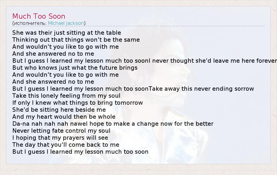 А как ты думаешь, о чем песня "Much Too Soon" ?