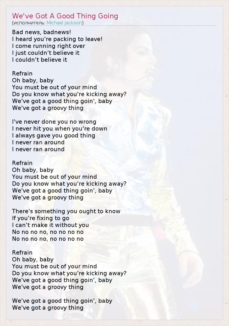 Bad news, badnews! I heard you're packing to leave! I come running right over I just couldn't believe it I couldn't believe it Refrain Oh baby, baby You must be out of your mind Do you know what you're kicking away? We've got a good thing goin', baby We've got a groovy thing I've never done you no wrong I never hit you when you're down I always gave you good thing I never ran around I never ran around Refrain Oh baby, baby You must be out of your mind Do you know what you're kicking away? We've got a good thing goin', baby We've got a groovy thing There's something you ought to know If you're fixing to go I can't make it without you No no no no, no no no no No no no no, no no no no Refrain Oh baby, baby You must be out of your mind Do you know what you're kicking away? We've got a good thing goin', baby We've got a groovy thing We've got a good thing goin', baby We've got a groovy thing