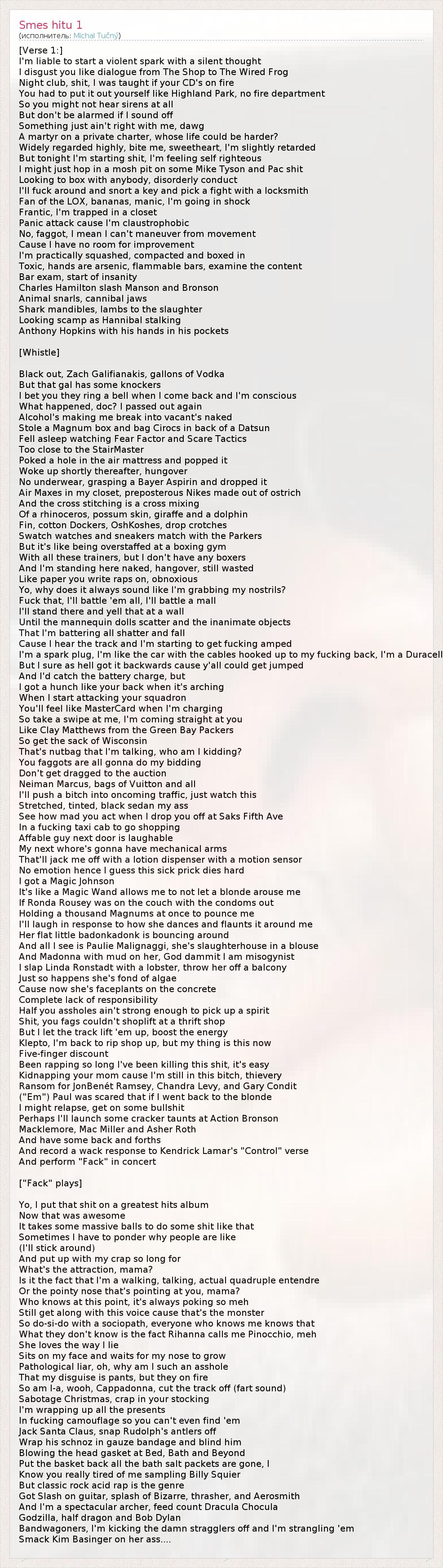 26 – Игра слов. Клей Мэттьюс (Clay Matthews) – американский футболист-полузащитник, входящий в команду Грин-Бей Пэкерс (Green Bay Packers). Штат Висконсин знаменит своими сырами. Но Эминем имеет в виду смегму, которая похожа на сыр, поэтому здесь использованы слова "nutbag" и "sack", означающих мошонку. Другими словами, Эминем говорит своим конкурентам отсосать у него.
