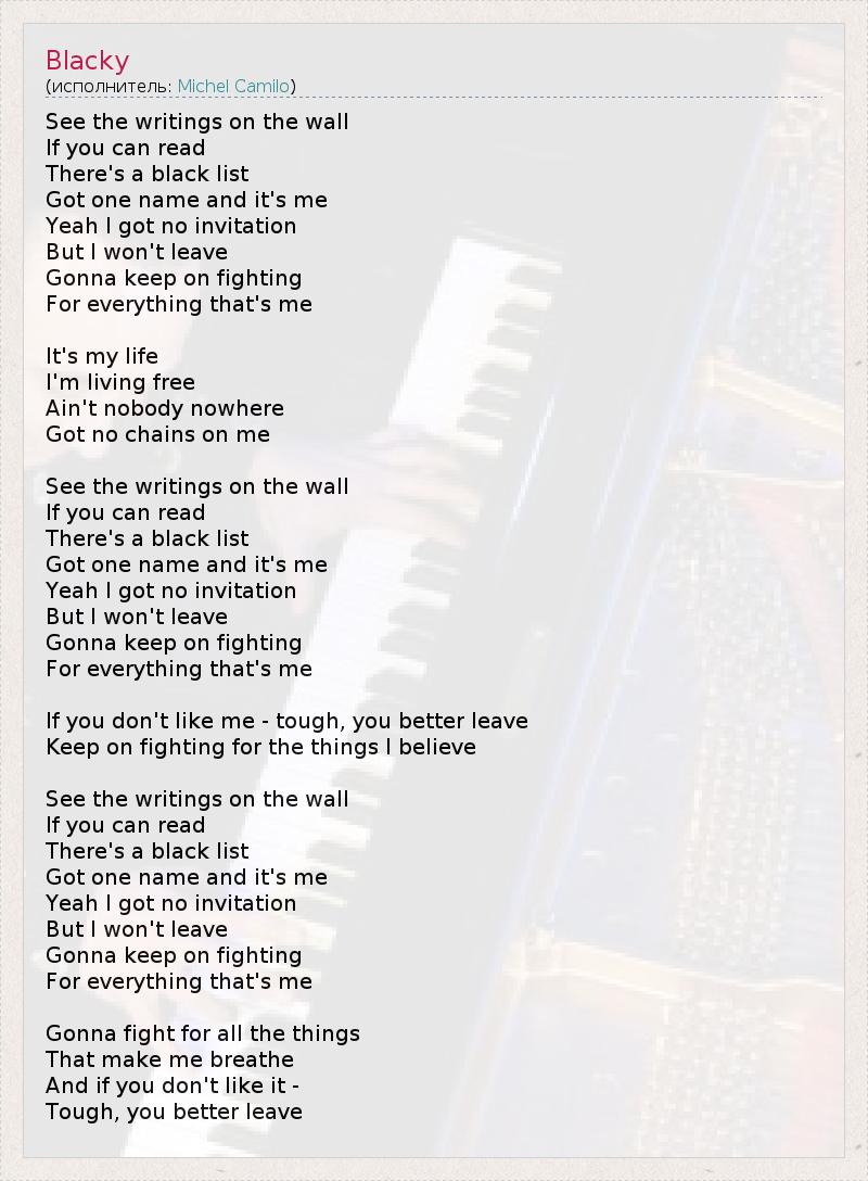 Смотри, надписи на стене, Если ты умеешь читать, [то увидишь, что] В черном списке Одно имя, и это – я. Да, меня не приглашали, Но я не уйду, Я буду продолжать бороться За все, чем я являюсь. Это - моя жизнь, Я живу свободным, Никому нигде Не заковать меня в цепи. Смотри, надписи на стене, Если ты умеешь читать, В черном списке Одно имя, и это – я. Да, меня не приглашали, Но я не уйду, Я буду продолжать бороться За все, чем я являюсь. Если я не нравлюсь тебе - упрямый, лучше уйди, Продолжаю бороться за то, во что верю. Смотри, надписи на стене, Если ты умеешь читать, В черном списке Одно имя, и это – я. Да, меня не приглашали, Но я не уйду, Я буду продолжать бороться За все, чем я являюсь. Я буду бороться за все, Что заставляет меня дышать. И если это не нравится тебе – Упрямый, лучше уйди.